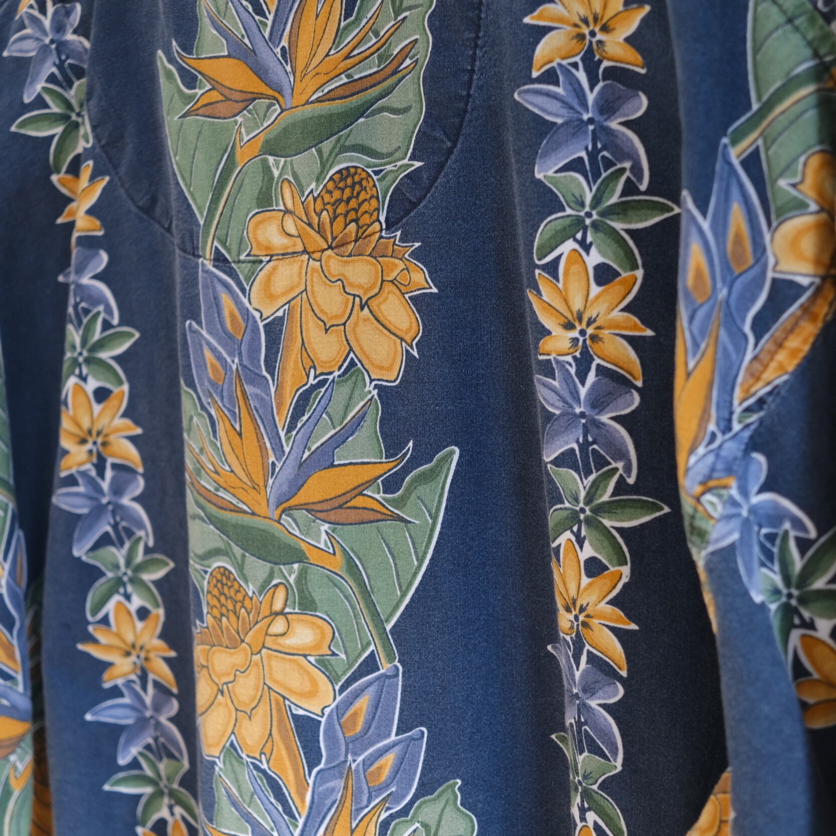 レーヨンではなく気持ちタフなコットンで、花柄の線も力強くハッキリしている、アロハの割に柄が控えめながら主張のある一枚です。
