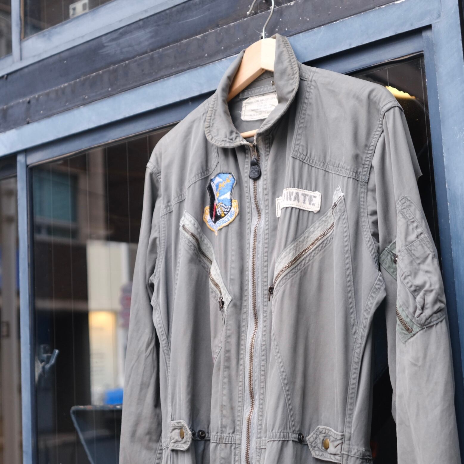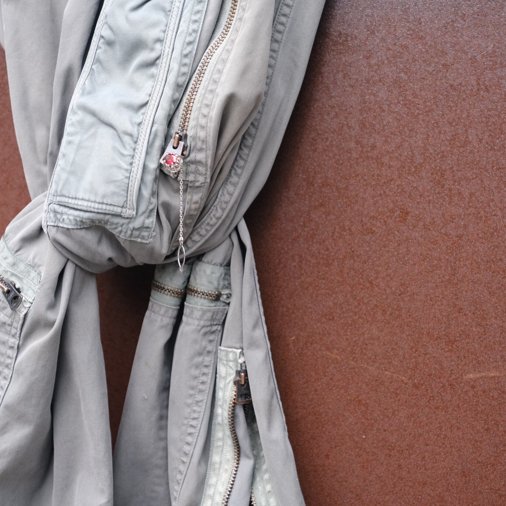 胸元のワッペン、左足ジップにつくピンも軍モノの生々しさがありますね。